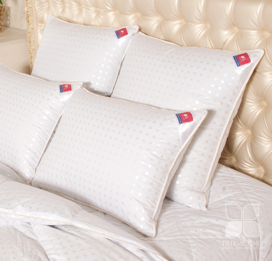 Для самых требовательных потребителей подушка в традиционном исполнении из белоснежного пуходержащего тика с мелким рисунком шашечки и шелковым кантом цвета шампань по периметру, изящно подчеркивающим форму.